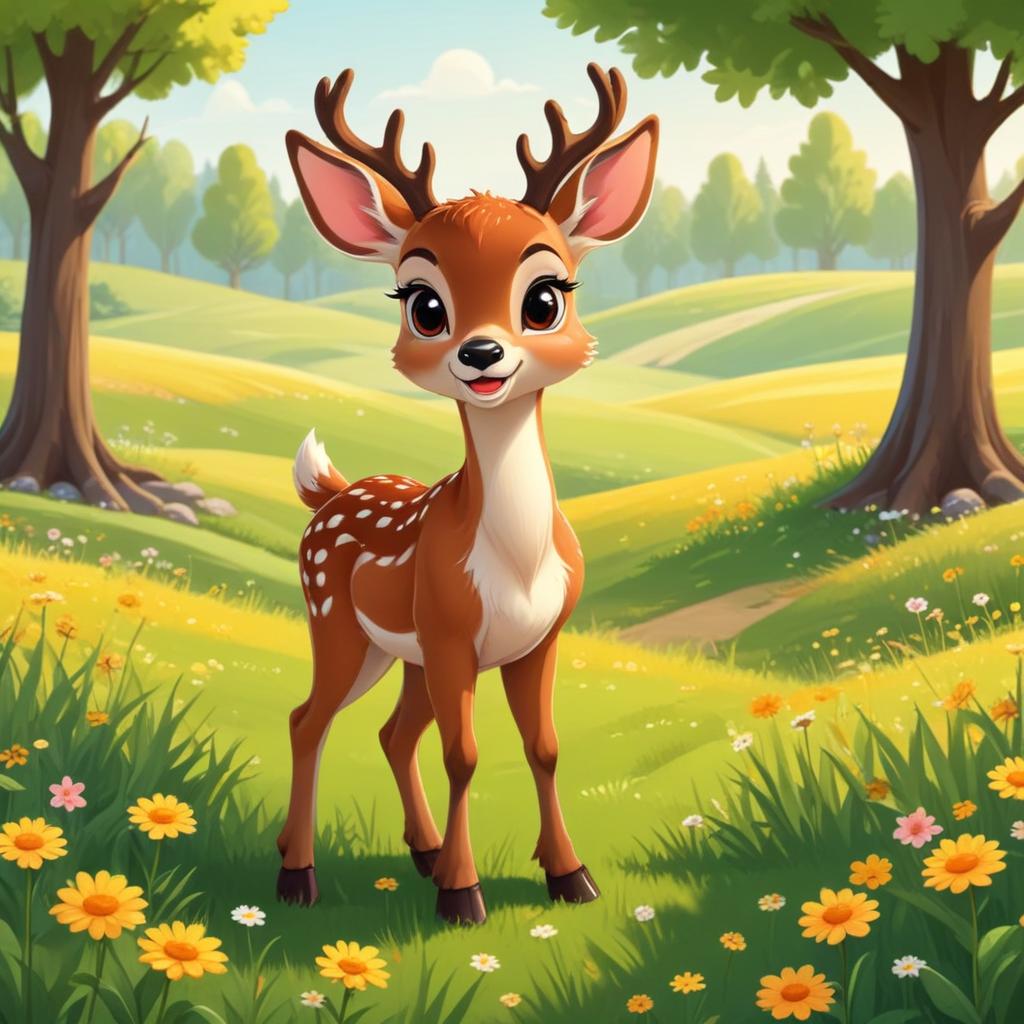 A cheerful deer stands in a bright meadow filled with flowers, surrounded by trees and rolling hills, enjoying the sunny day.