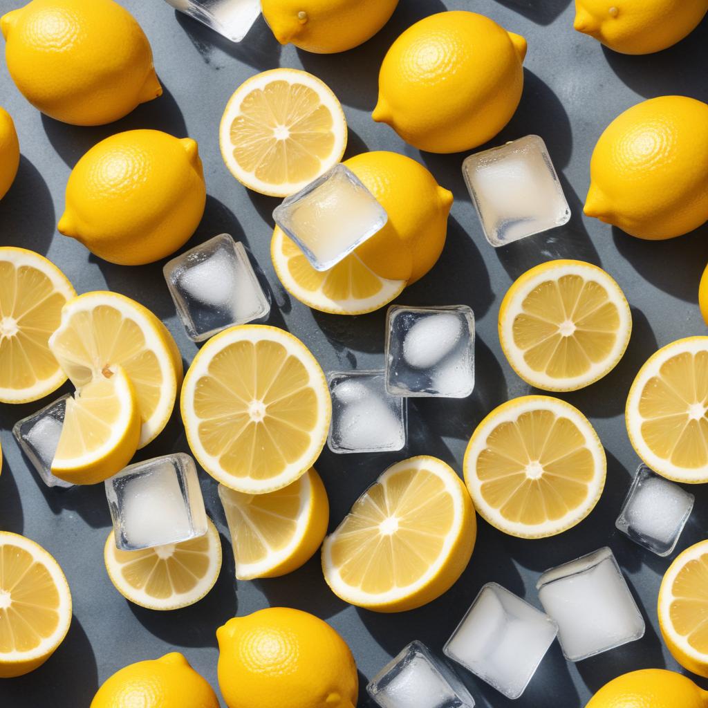 Fresh lemons and ice cubes are arranged on a flat surface, creating a vibrant and refreshing scene perfect for summer drinks.