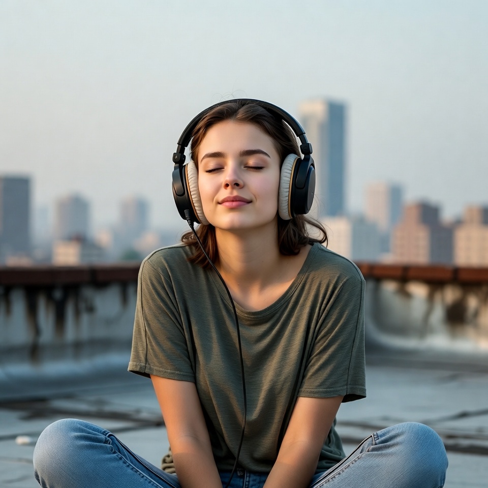 Young woman sits cross-legged on a rooftop, wearing headphones and enjoying the city view during sunset, eyes closed in peaceful bliss.