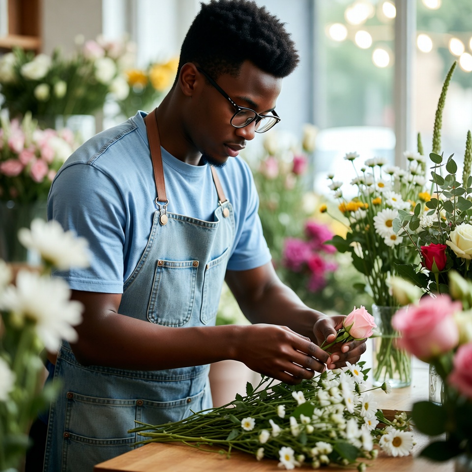 A florist carefully arranges colorful flowers in a busy shop during daylight, surrounded by various floral displays and greenery.