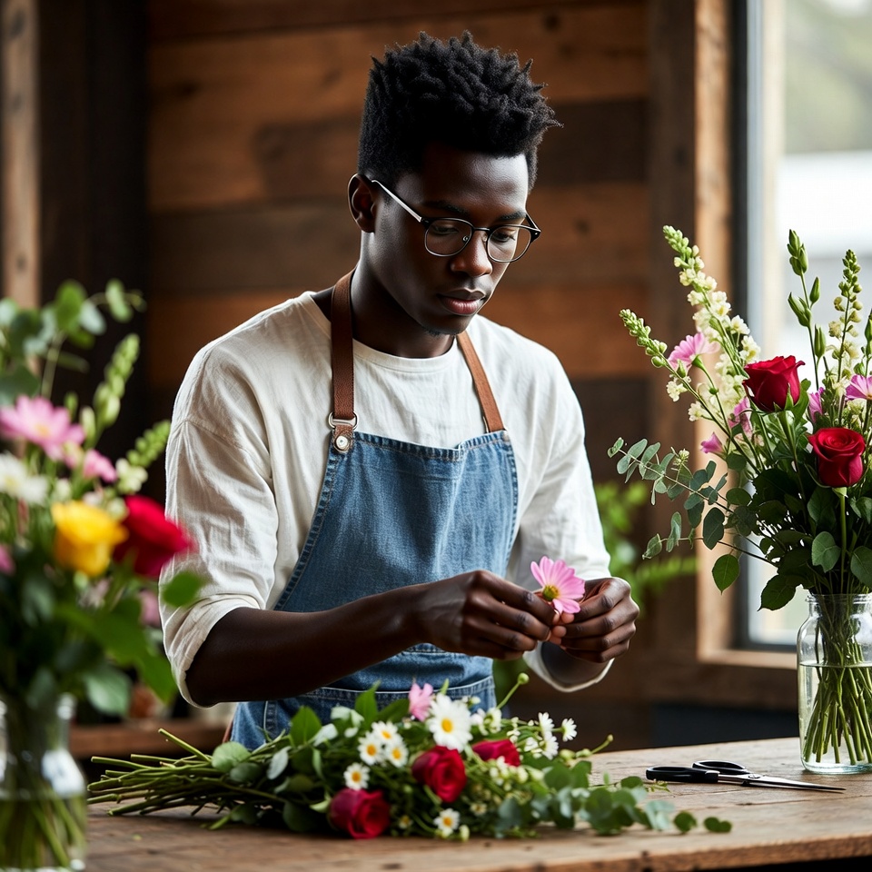 A young man carefully arranges colorful flowers in a rustic shop, surrounded by fresh blooms and greenery. It's a bright, inviting atmosphere.