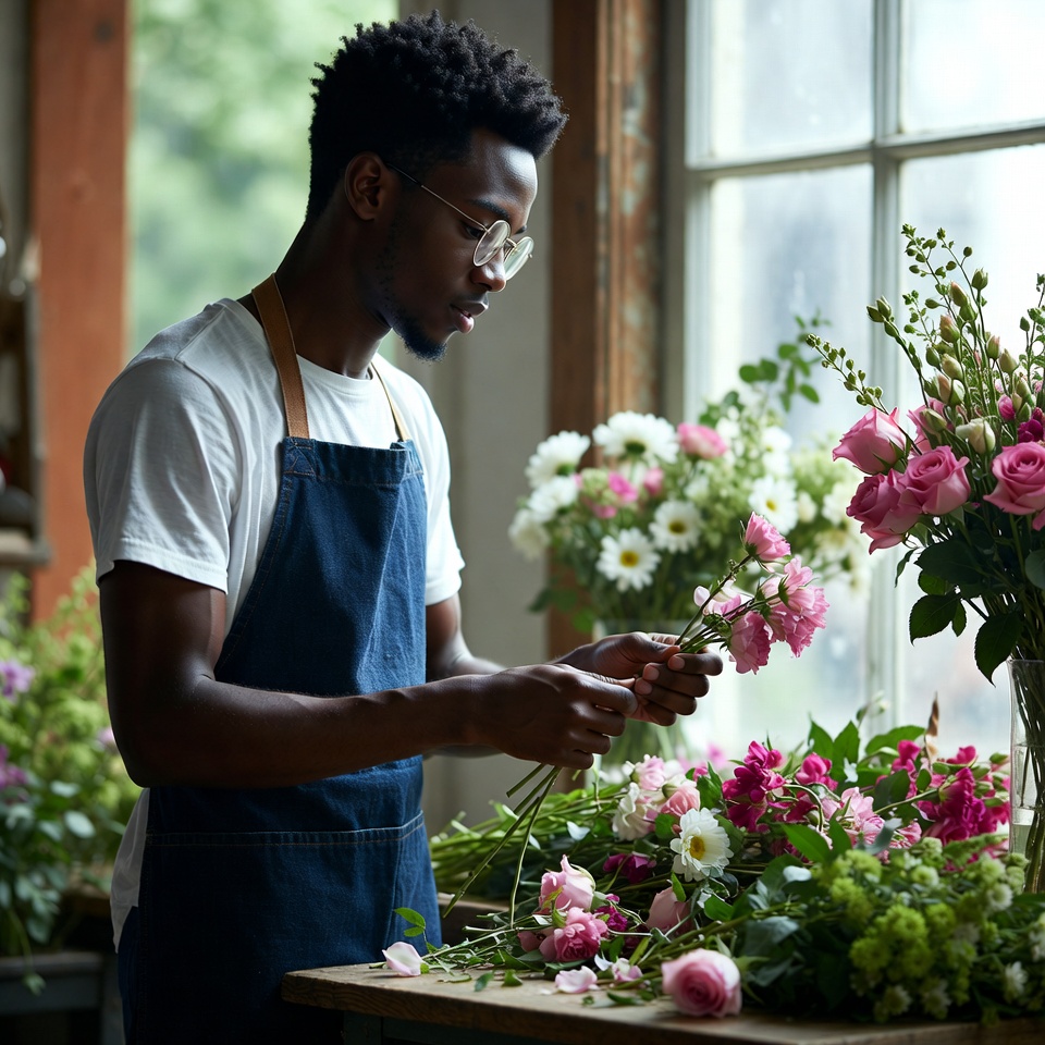 A man skillfully arranges fresh flowers in a bright, rustic workshop filled with colorful blooms and natural light streaming through the window.