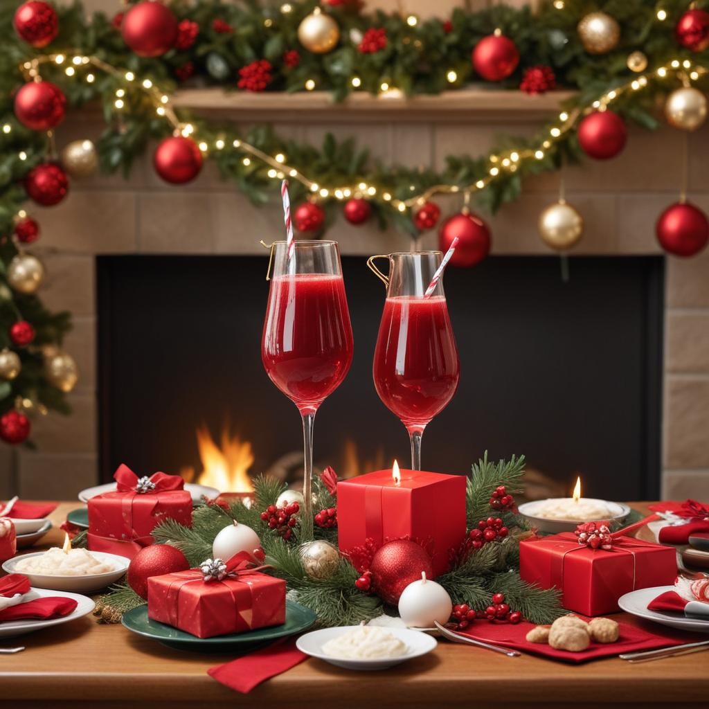 Bright red drinks sit in tall glasses on a festive table decorated with presents and ornaments. A cozy fireplace glows in the background.