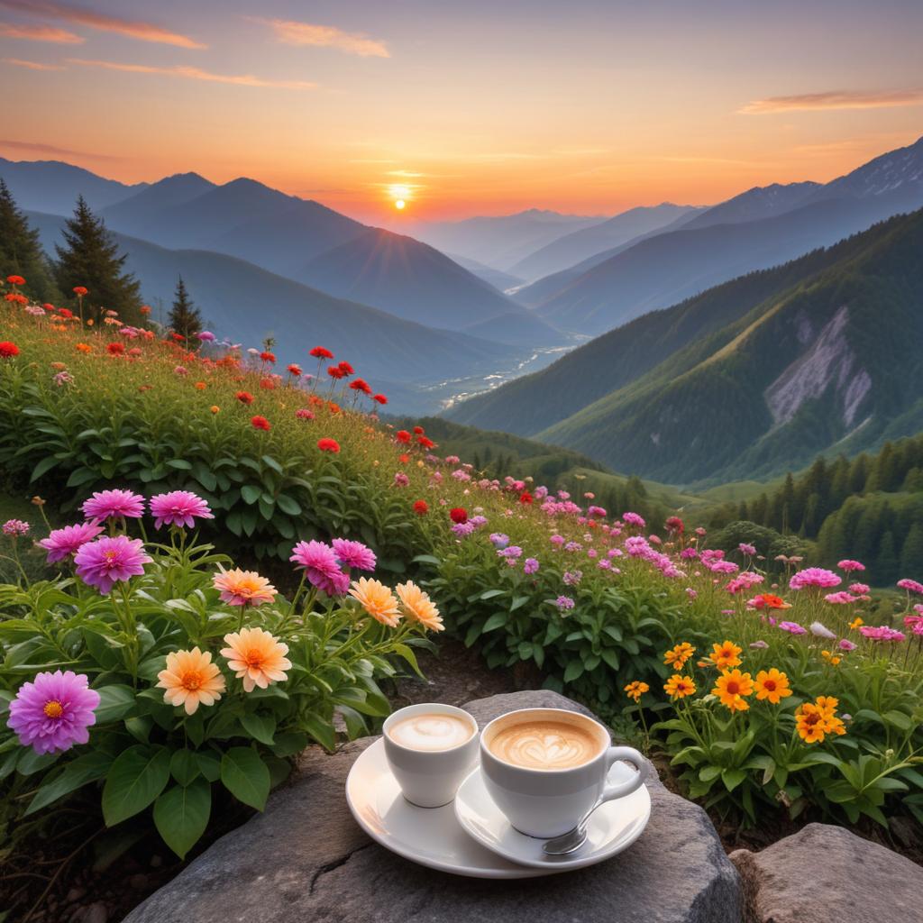 Two cups of coffee sit on a stone amidst vibrant flowers, overlooking a stunning mountain view at sunrise. Nature's beauty enhances the moment.