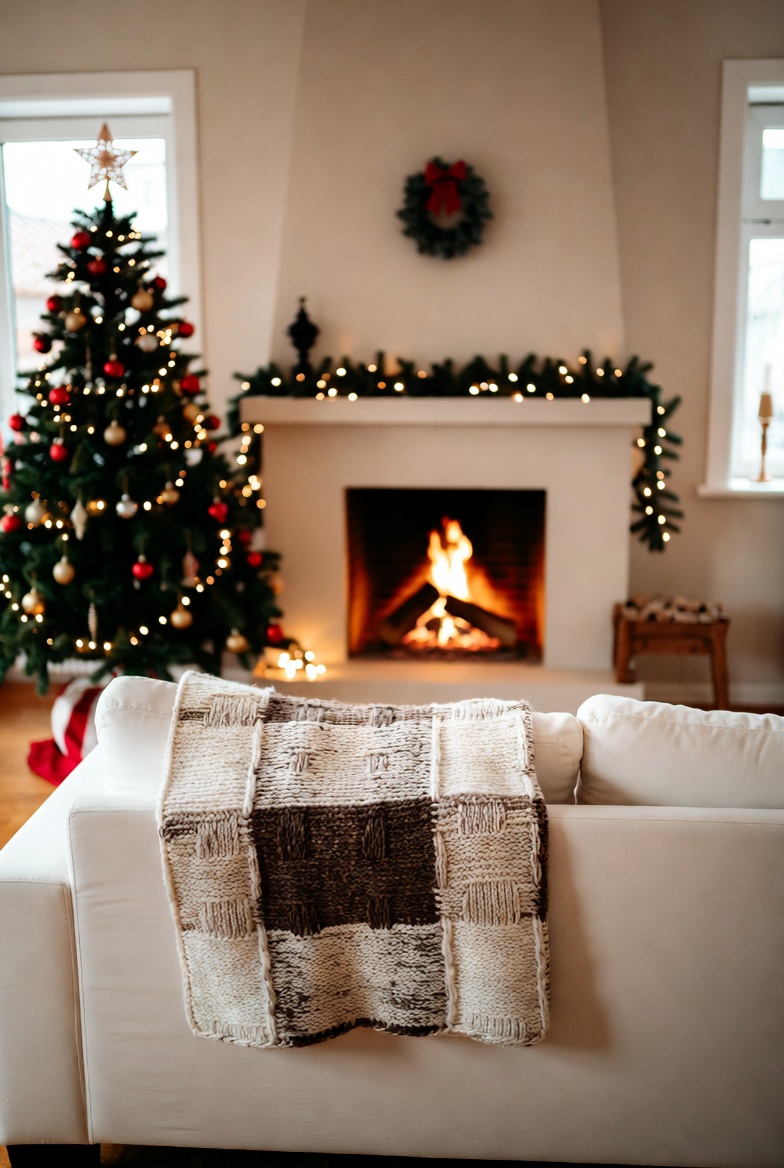 blanket, christmas, comfort, cozy, decorations, family, festive, fireplace, gathering, holiday, interior, lights, living room, ornaments, scene, style, tree, warm, winter, wreath
