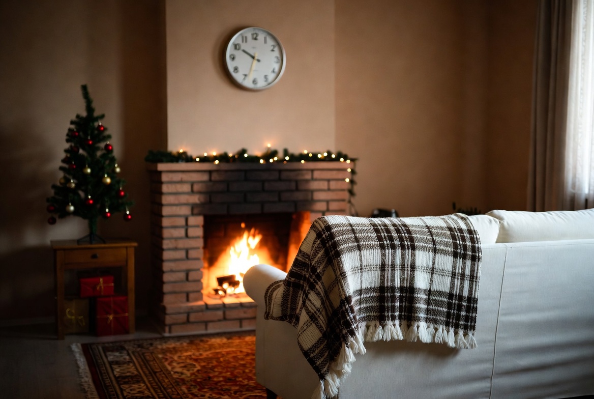 A warm living room features a lit fireplace, a Christmas tree, and a comfy couch with a blanket, setting a relaxing winter atmosphere.