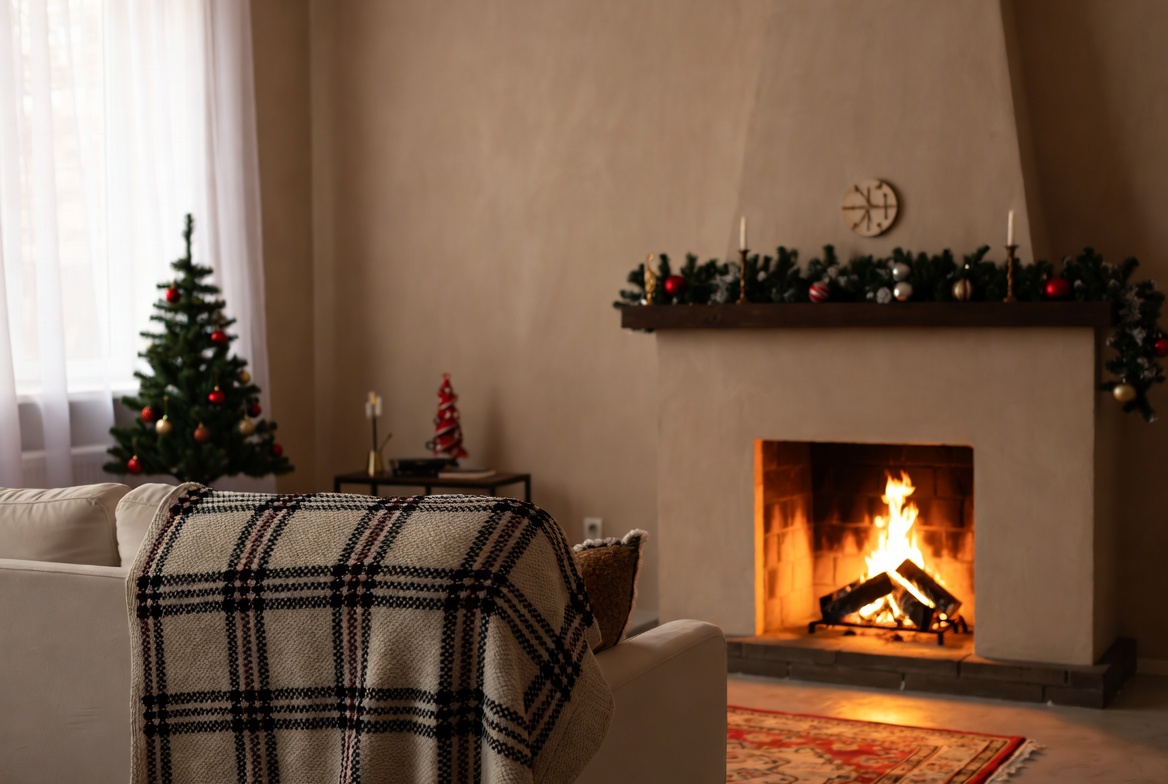 A warm living room features a glowing fireplace and decorated Christmas tree. Soft blanket rests on the sofa, creating a welcoming atmosphere.