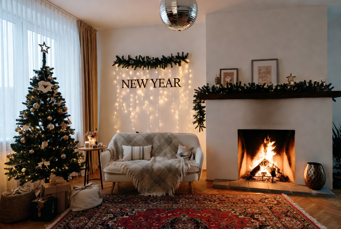 Warm, inviting room featuring a decorated Christmas tree, glowing fireplace, and festive New Year decorations, creating a cozy holiday atmosphere.