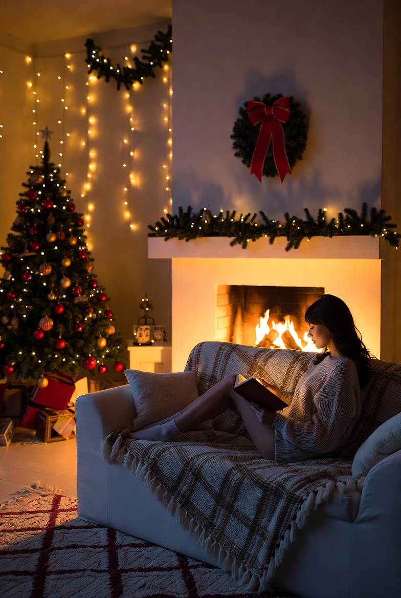 Warm light fills the room as a woman reads on a couch near a decorated Christmas tree. The fireplace crackles softly, creating a relaxing atmosphere.