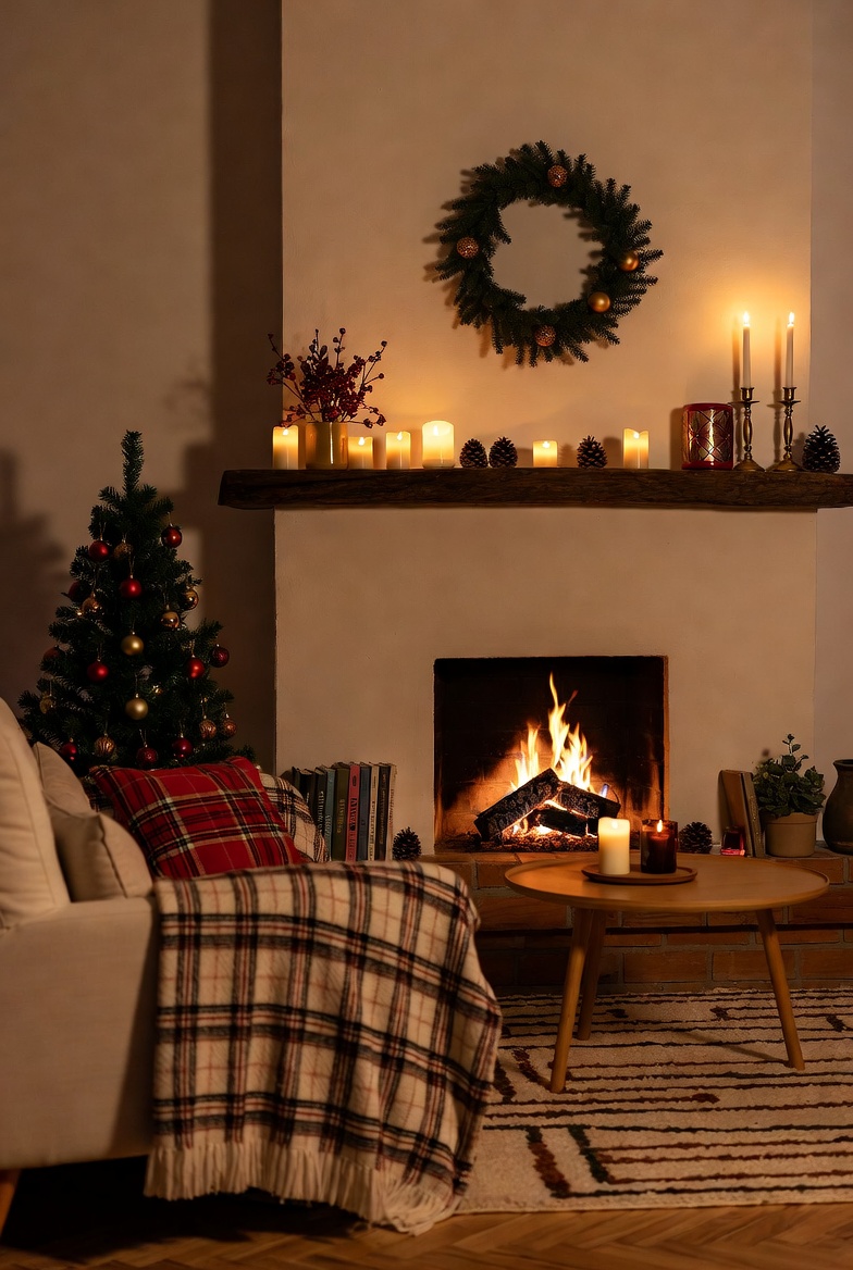 ambiance, blanket, candles, comfort, cozy, decorations, fireplace, firewood, furniture, holiday, home, indoor, living room, pinecones, rug, seasonal, tree, warm, winter, wreath