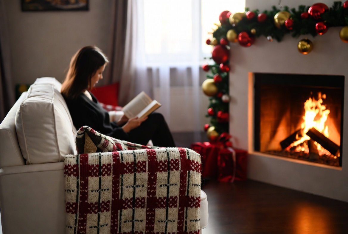A woman enjoys a book while seated by a warm fireplace decorated for the holidays, creating a peaceful and inviting atmosphere.