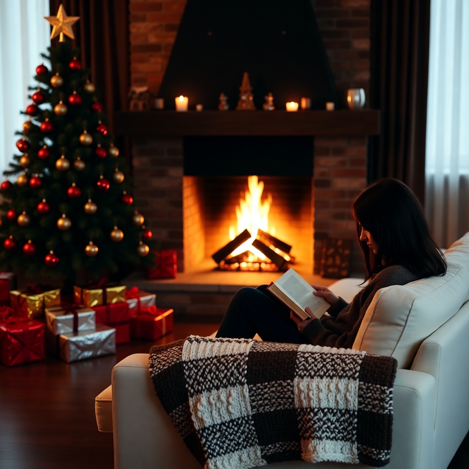 Warm light fills the room as a person relaxes on a couch, reading a book by a glowing fireplace and a decorated Christmas tree.