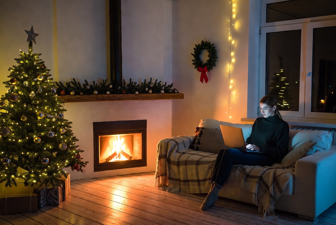 christmas, comfort, cozy, decorations, evening, festive, fireplace, holiday, home, indoor, joy, laptop, lights, living room, relaxation, serene, tree, warmth, winter, woman