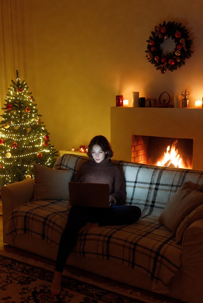 A woman sits on a couch working on a laptop. Soft lights from a Christmas tree and candles create a warm atmosphere on a winter night.