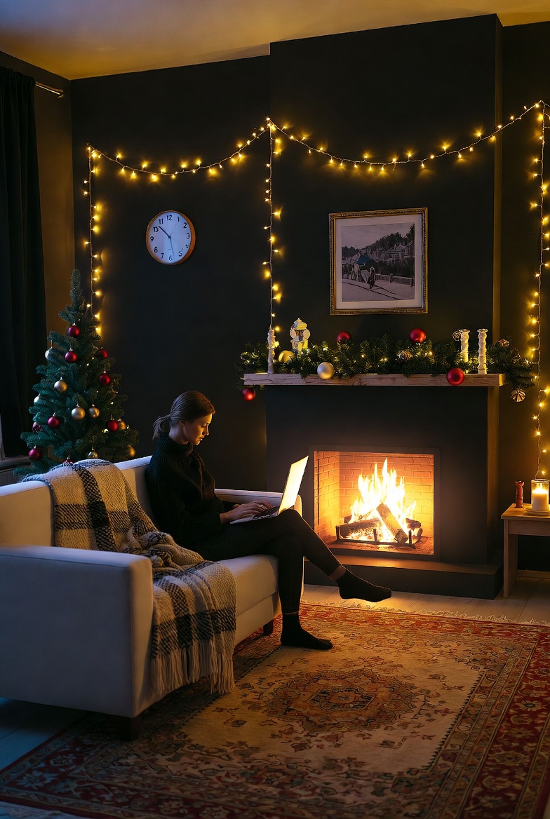 A cozy winter scene features a woman working on a laptop next to a glowing fireplace with Christmas decorations adorning the room.