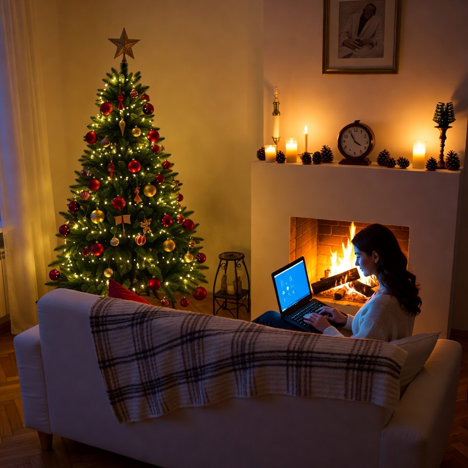 A woman sits on a couch with a laptop, enjoying a warm glow from the fireplace and decorated Christmas tree in a cozy living room.