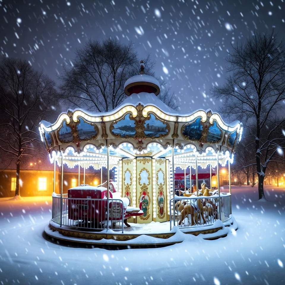 A beautifully lit carousel stands in the snow at night, surrounded by trees. Snowflakes gently fall, creating a magical winter scene.