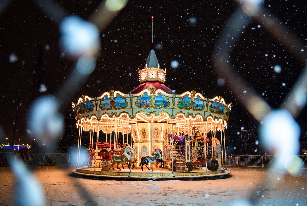 activities, amusement park, carousel, cold, colorful, decoration, entertainment, family, festive, festive season, fun, holiday, horses, joy, lights, night, outdoor, scene, snow, winter