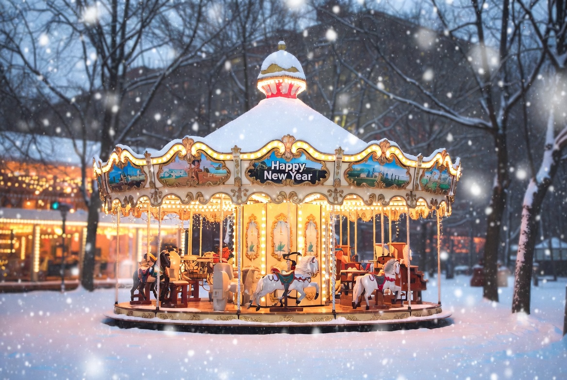 New Year, amusement, animals, carousel, celebration, decorations, entertainment, family, festive, fun, holiday, joy, lights, nightlife, outdoor, scene, snow, snowflakes, winter, winter wonderland