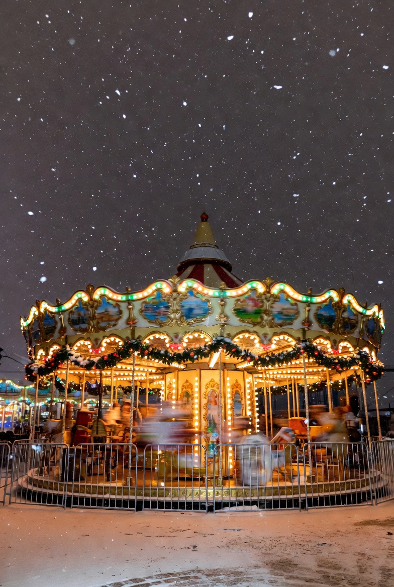 amusement, attraction, carousel, celebration, decorations, entertainment, event, family, festive, funfair, joy, laughter, lights, night, outdoor, ride, seasonal, snow, spinning, winter