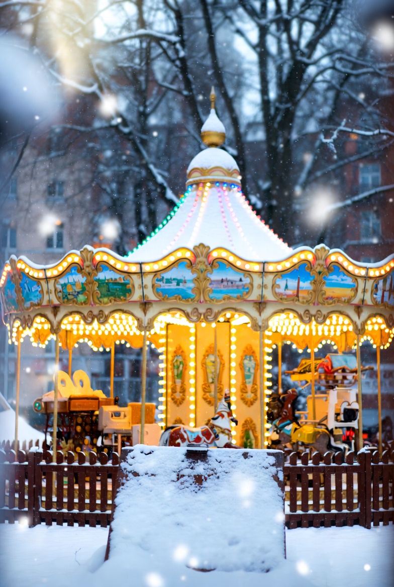 amusement, attraction, carousel, children, colorful, entertainment, family, festive, fun, holiday, joy, lights, outdoor, park, play, scenery, season, snow, tradition, winter