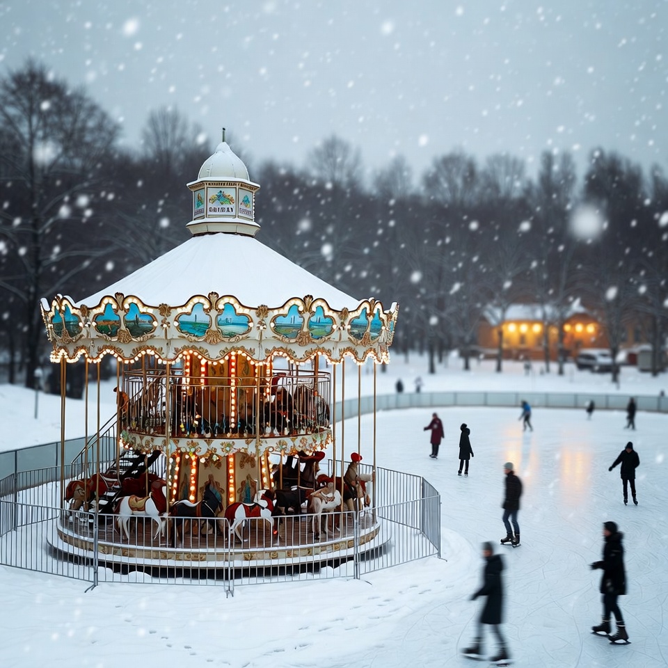 A winter scene features a beautifully decorated carousel surrounded by snow. People ice skate nearby, enjoying the chilly atmosphere.