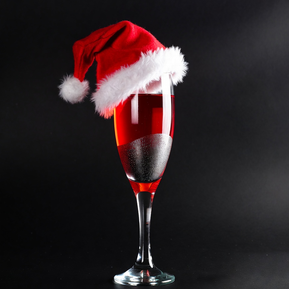 A sparkling red drink sits in a tall glass, adorned with a small Santa hat, creating a festive holiday atmosphere.