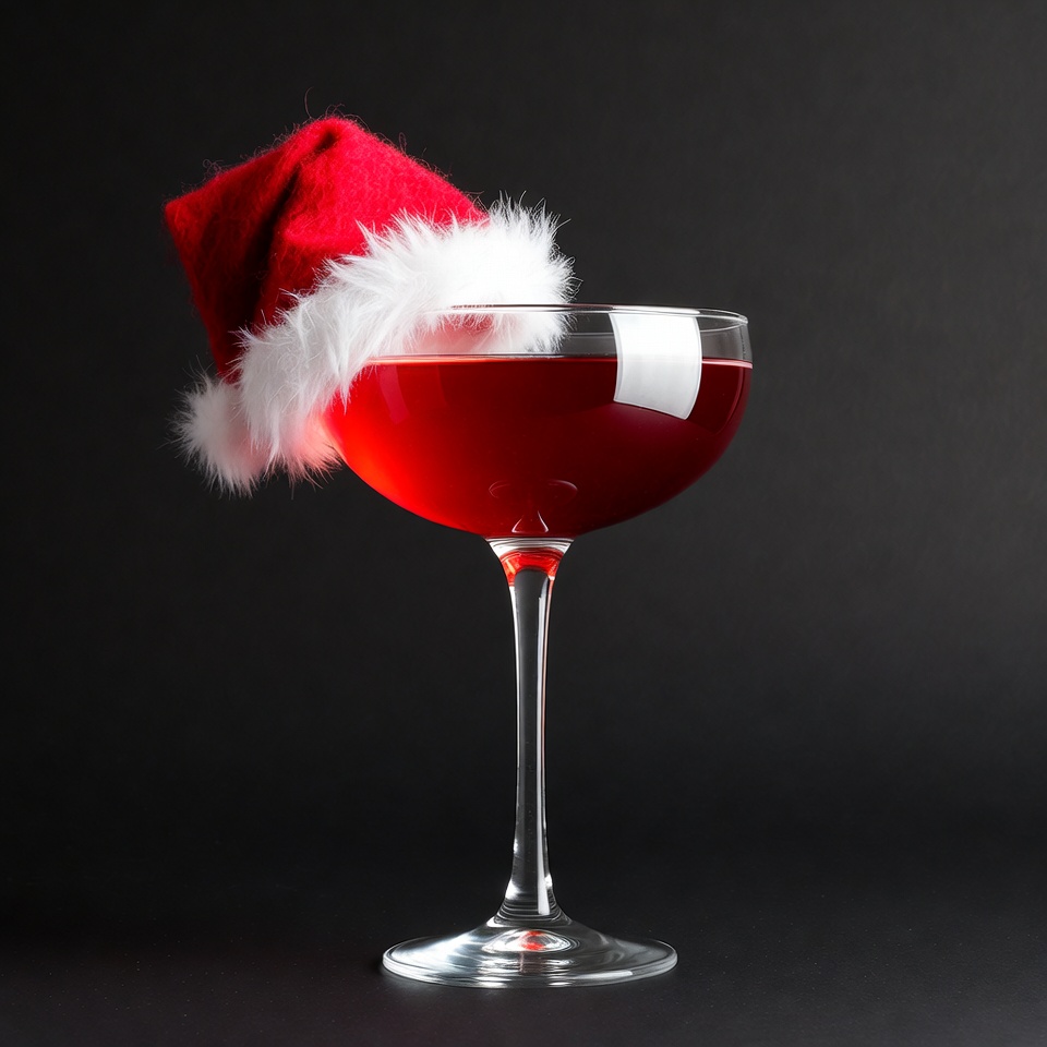 A festive red cocktail is placed in a stylish glass, topped with a miniature Santa hat, perfect for holiday celebrations or parties.