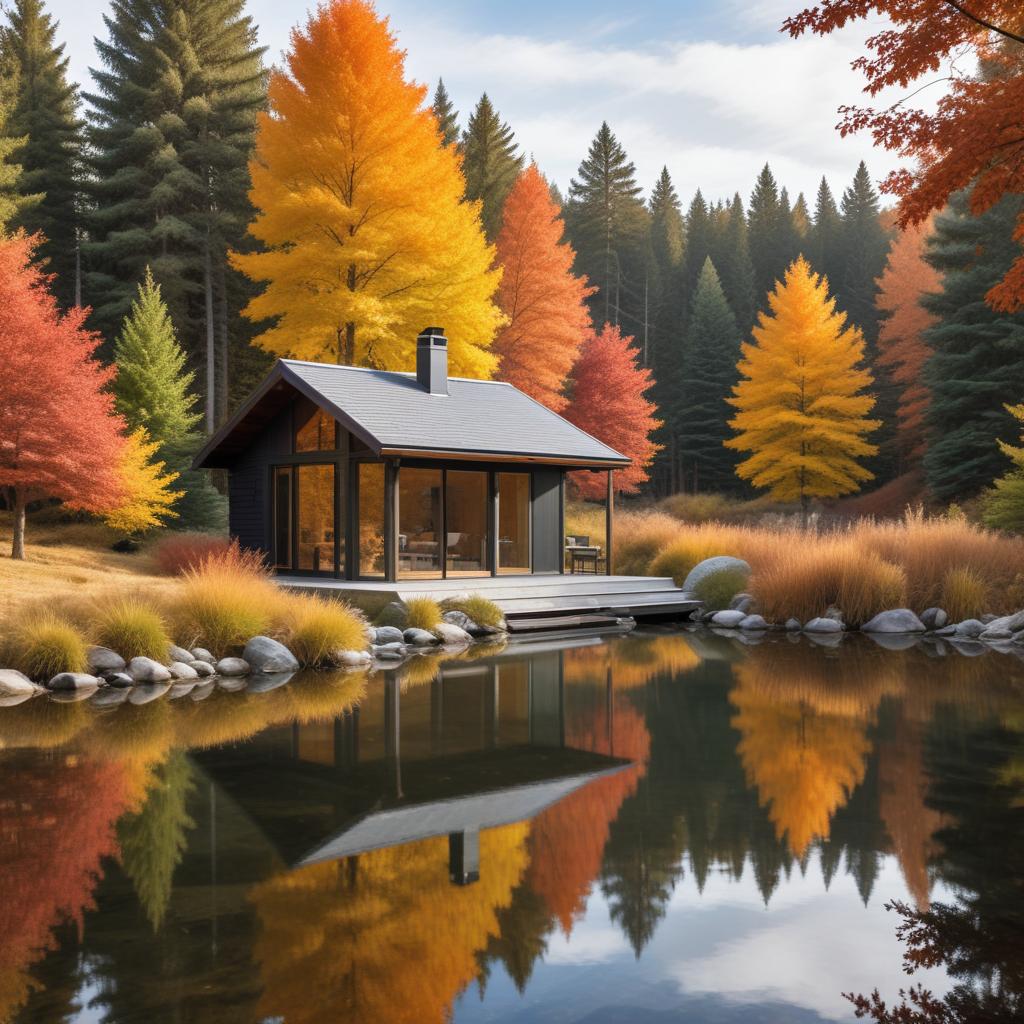 A charming cabin sits beside a serene lake, surrounded by vibrant autumn trees in shades of orange and yellow, reflecting in the water.