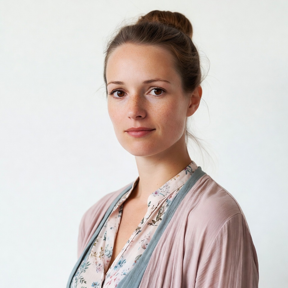 A young woman stands thoughtfully against a plain background, displaying a calm expression and delicate features.