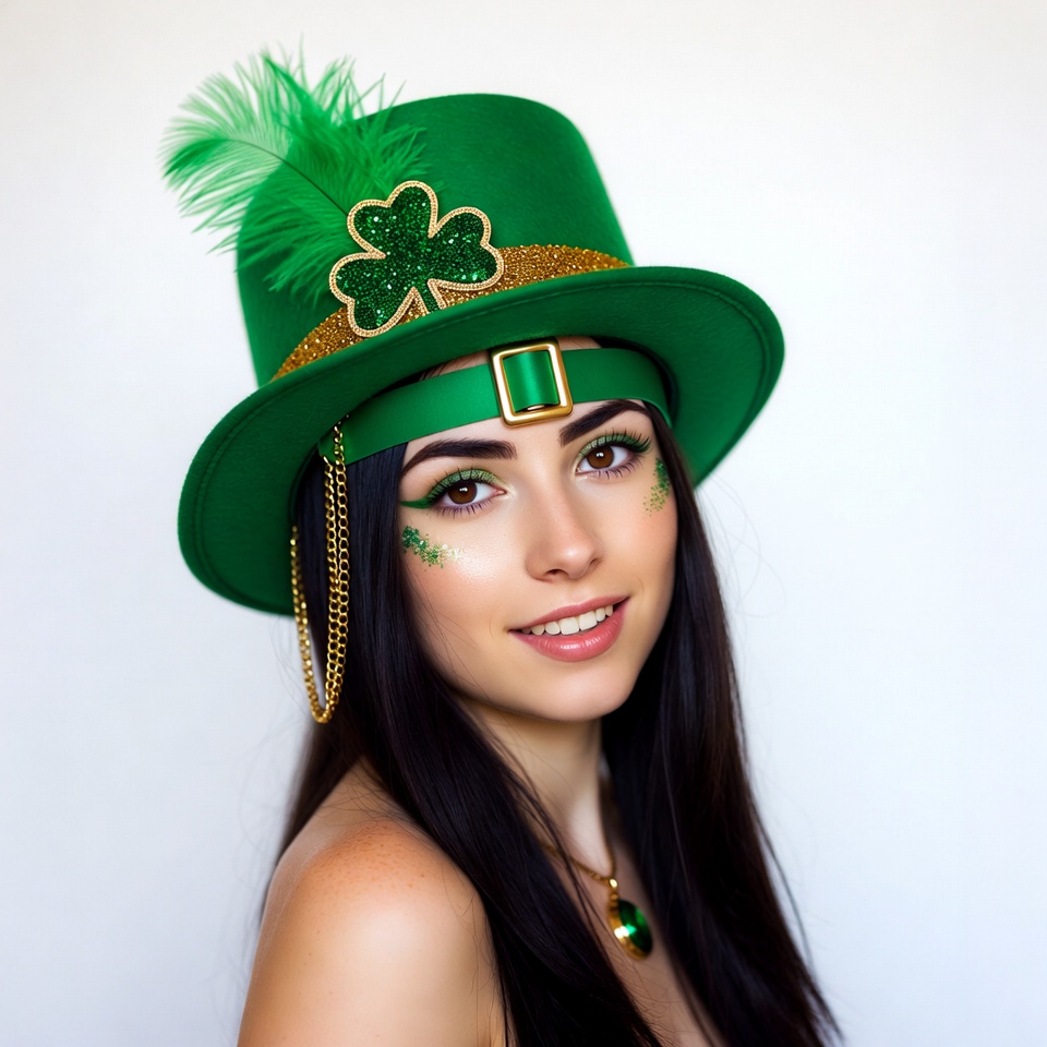 A young woman enjoys St. Patrick's Day festivities with a green hat and shamrock decorations. She smiles brightly, embodying the holiday spirit.