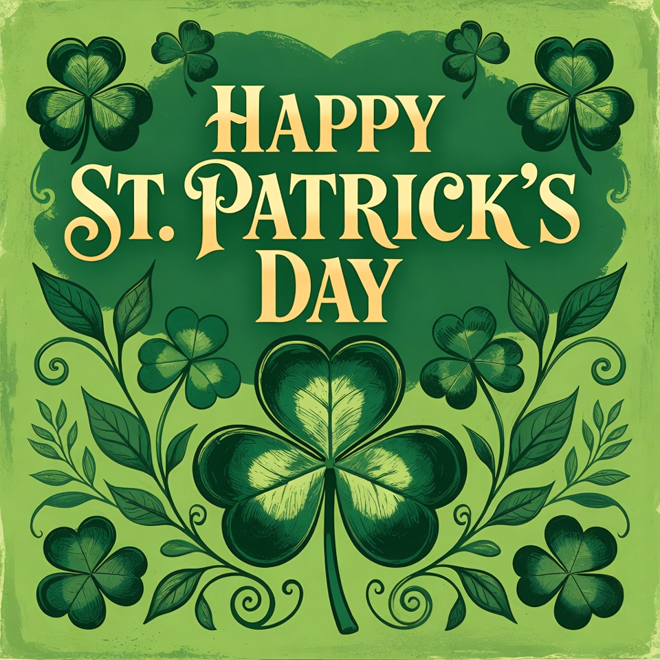 Bright green background with shamrocks and elegant text wishing happy St. Patrick's Day. Perfect for festive decorations and celebrations.