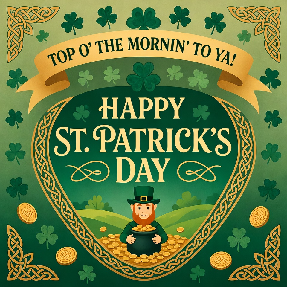 Cheerful illustration wishes joy for St. Patrick's Day with a leprechaun surrounded by coins and shamrocks in a lively green setting.
