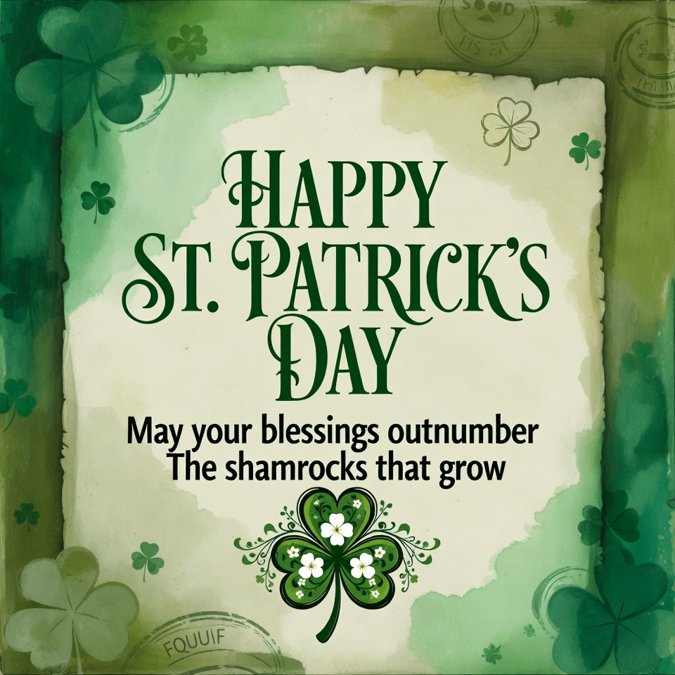 A festive greeting for St. Patrick's Day featuring green shamrocks and cheerful wishes for blessings and good luck.