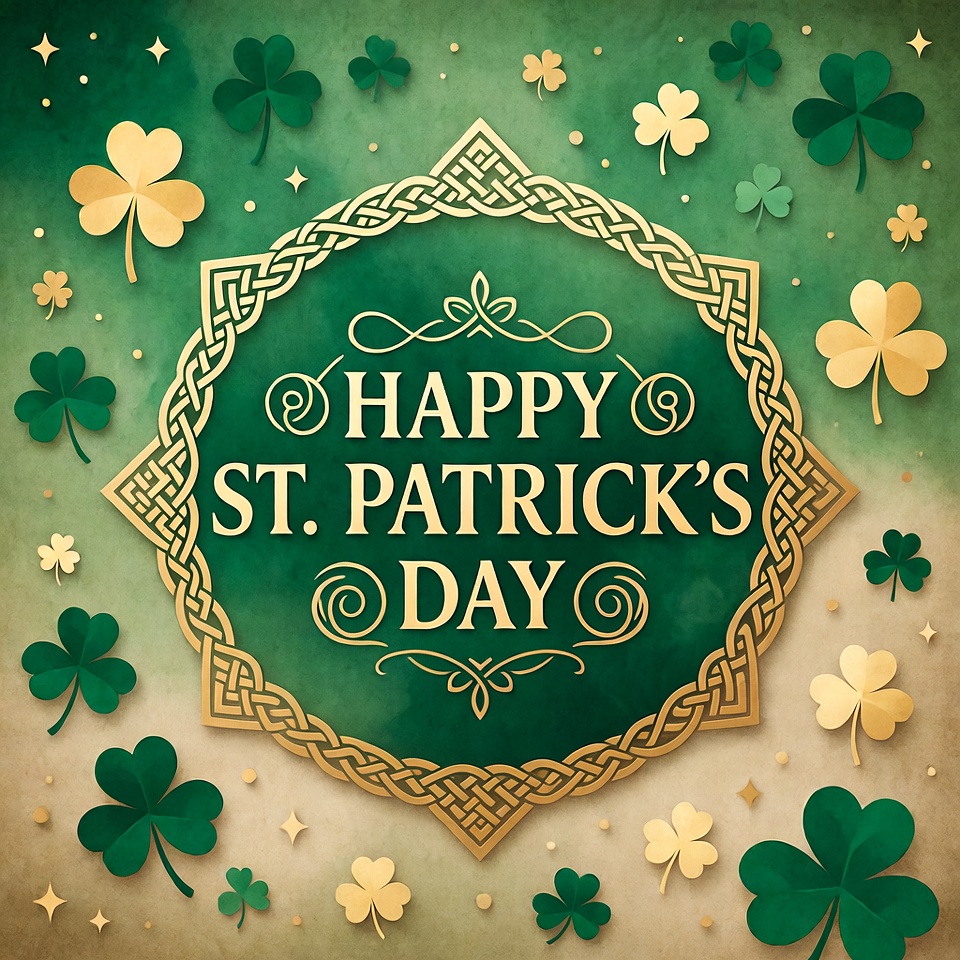 Bright green background features decorations for St. Patrick's Day, showcasing clovers and golden text wishing happiness for the holiday.