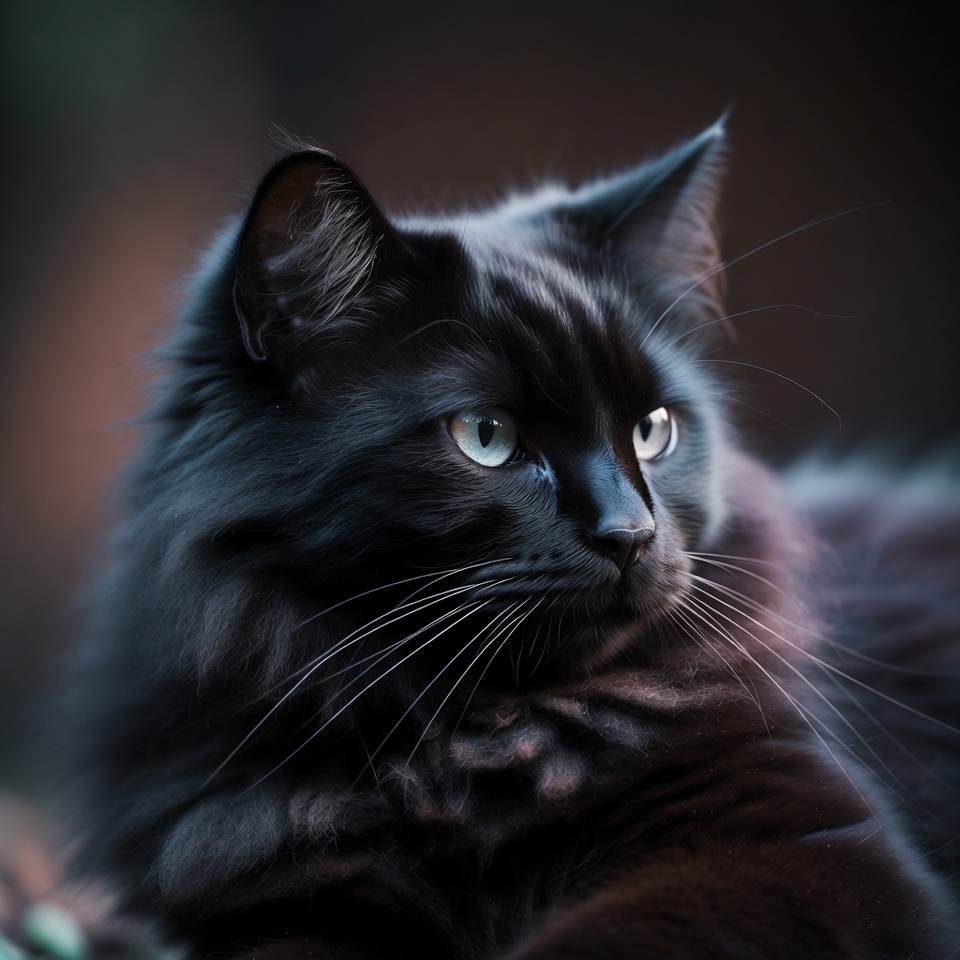 animal, beauty, black cat, calm, close-up, creature, domestic, elegant, eyes, feline, fluffy, fur, gaze, nature, pet, portrait, serene, soft light, tranquil, whiskers