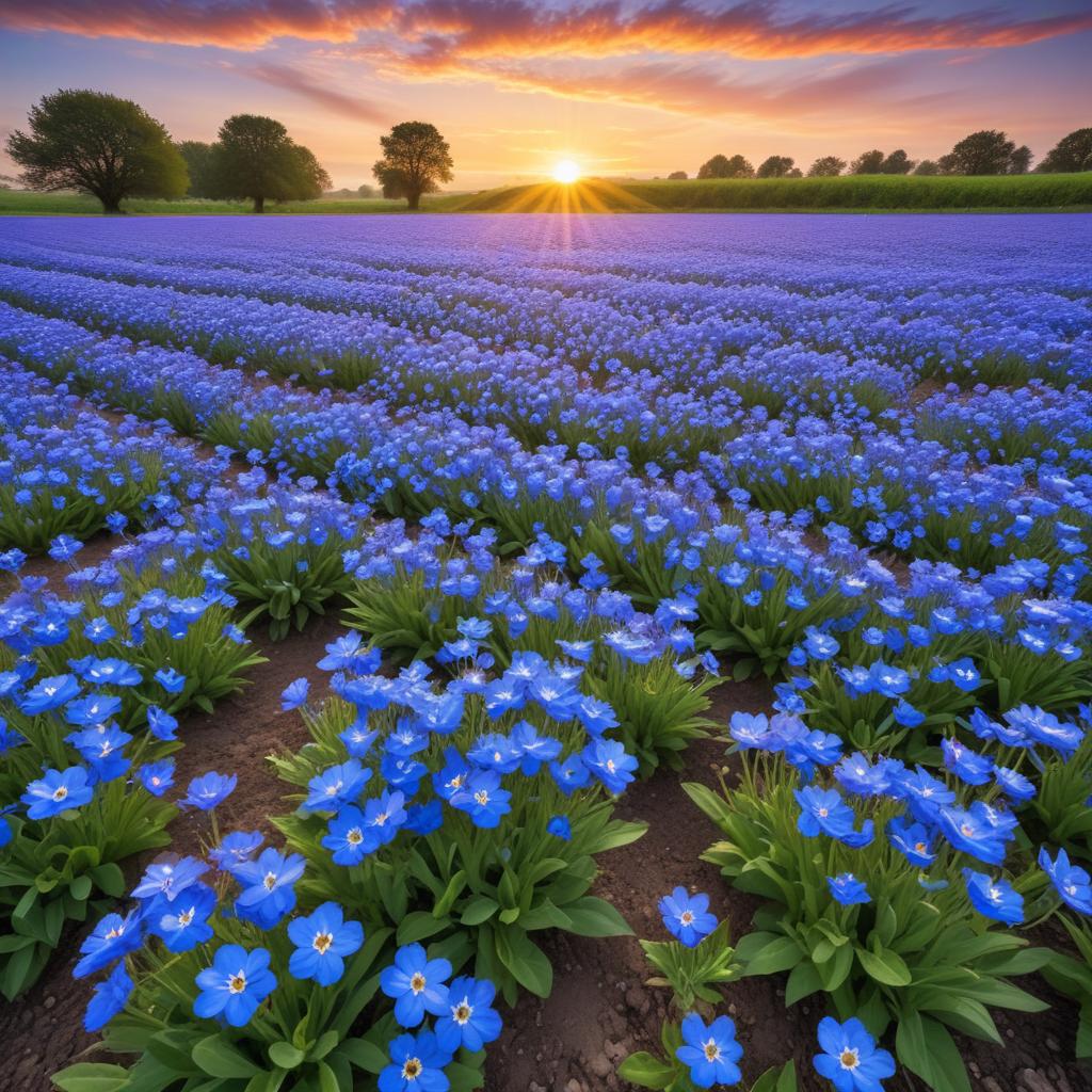 The sun rises over a vast field of blue flowers, casting a warm glow. Trees line the horizon, enhancing the serene morning atmosphere.