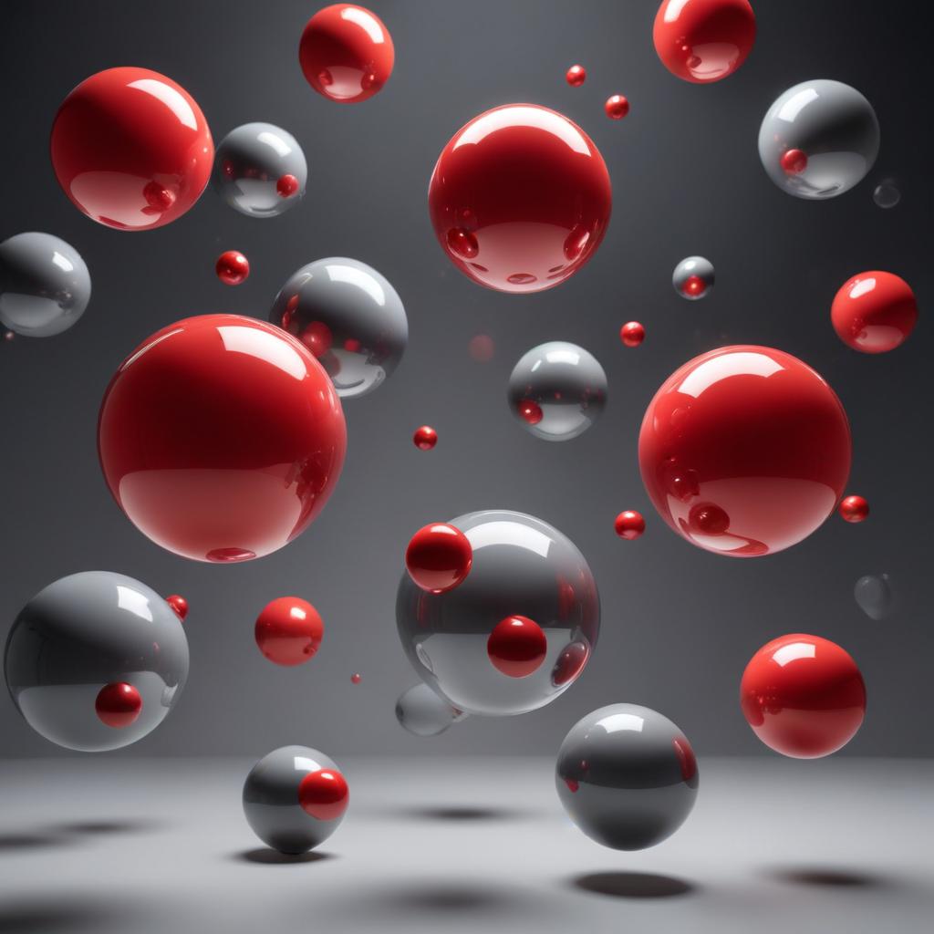 Spheres in red and gray colors hover in mid-air against a dark background, creating a striking visual effect of movement and depth.