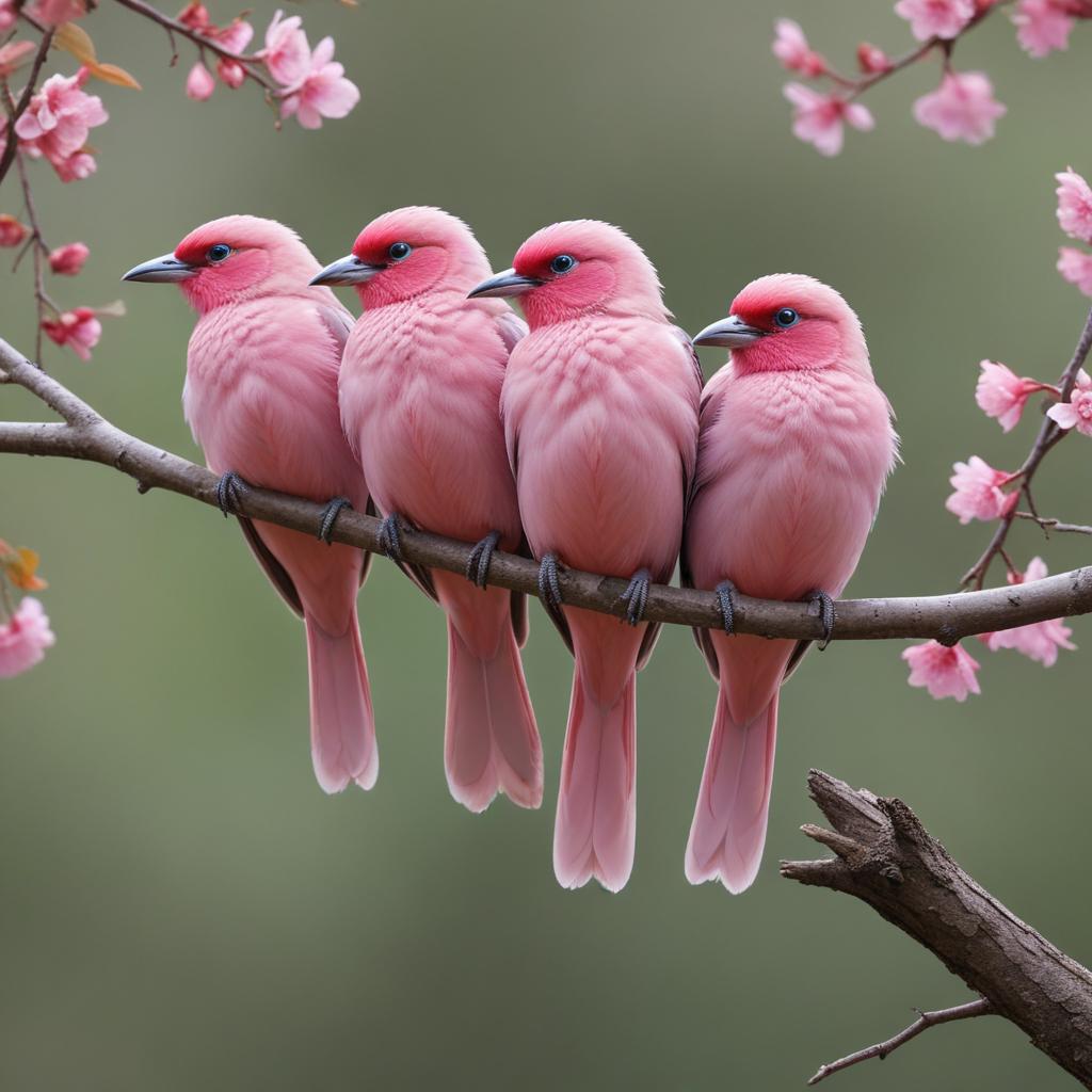 Four fluffy pink birds sit closely together on a branch adorned with cherry blossoms, creating a vibrant scene in nature.
