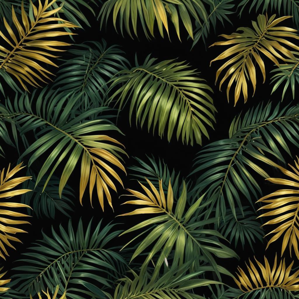 Lush green and yellow palm leaves create a vibrant pattern against a dark backdrop, showcasing tropical beauty and natural diversity.