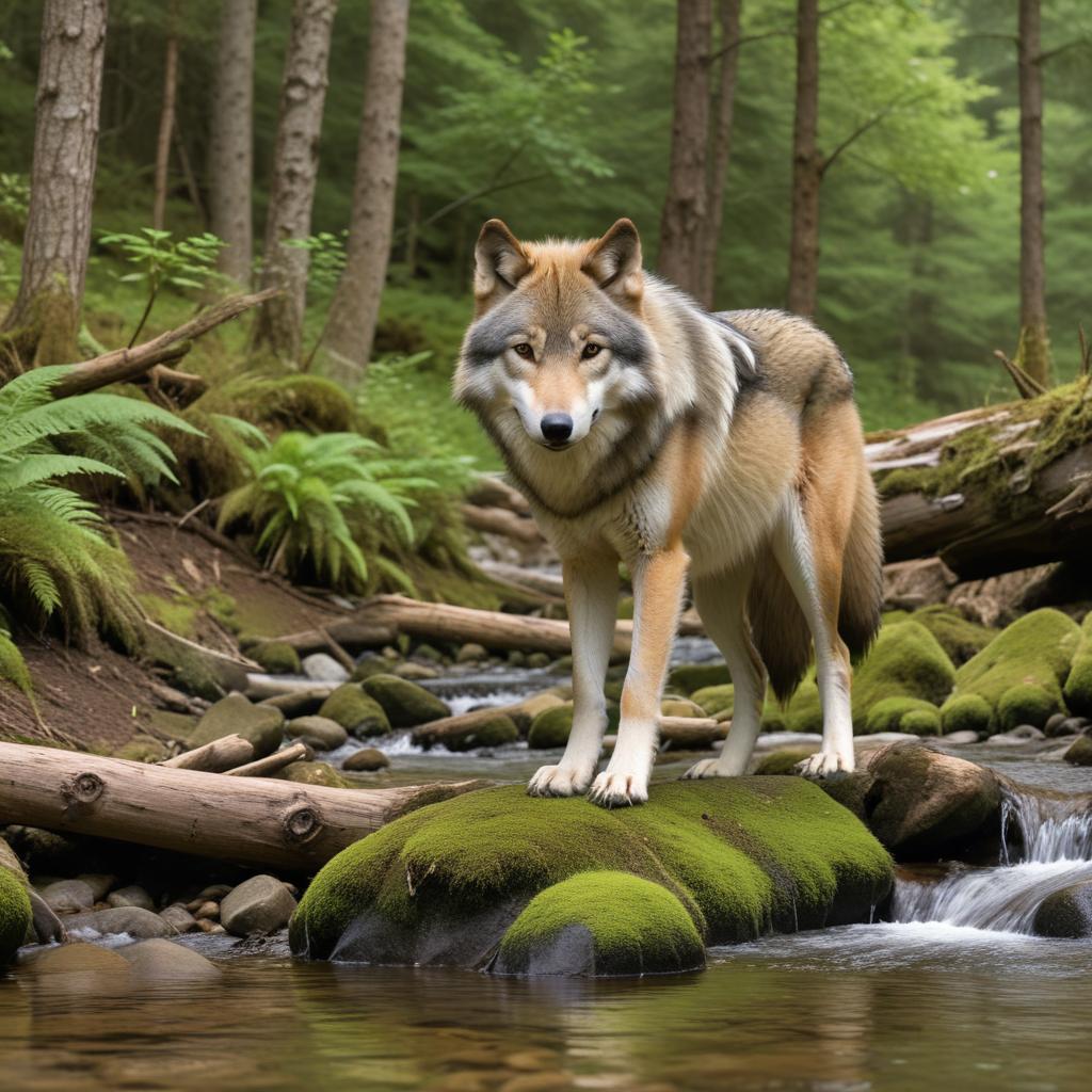 A wolf stands alert on a moss-covered rock beside a clear stream in a lush green forest. The scene captures the serene beauty of nature.