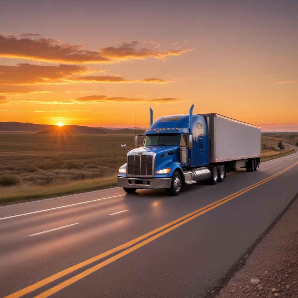 blue, commerce, driving, fields, freight, highway, hills, horizon, journey, landscape, long haul, orange, road, scenic, sunset, transportation, travel, truck, vehicle, yellow