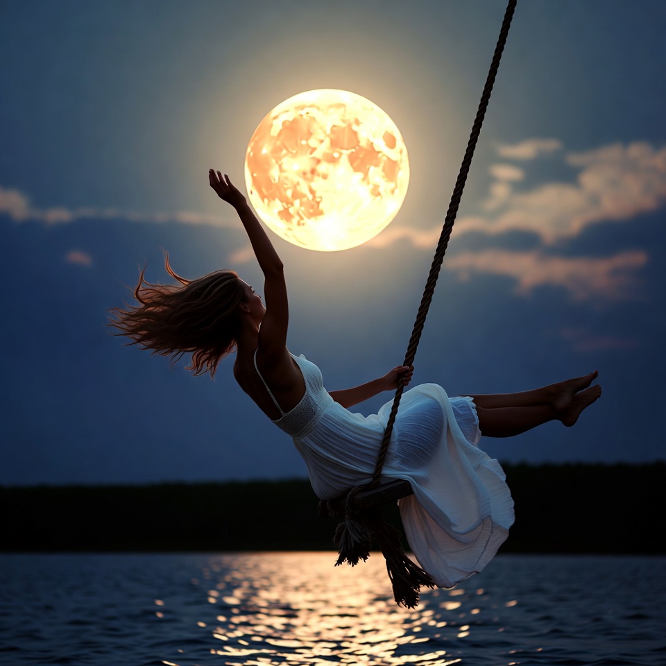 A woman in a white dress swings gracefully over a calm body of water, illuminated by the bright glow of a full moon at dusk, creating a magical scene.
