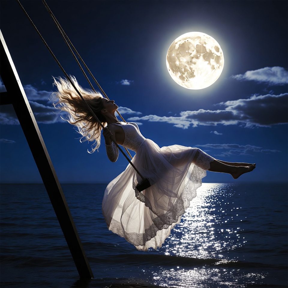 A woman in a white dress swings gently above the ocean at night, illuminated by a bright full moon that shines on the water.