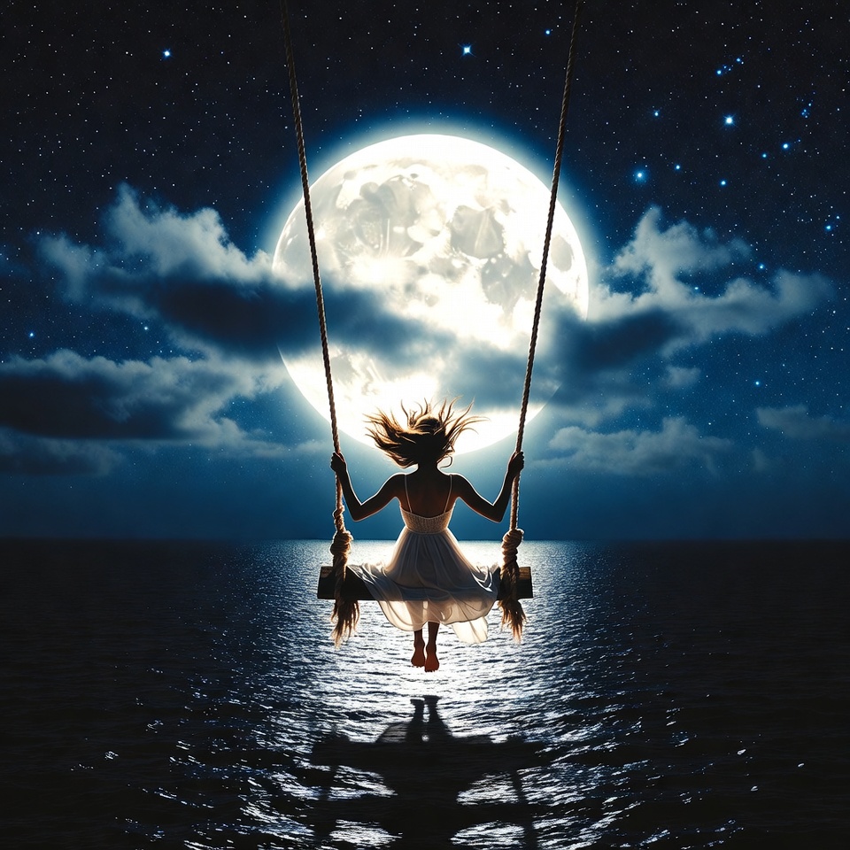 A woman swings over the ocean at night, illuminated by a bright full moon and twinkling stars. The scene is serene and magical.