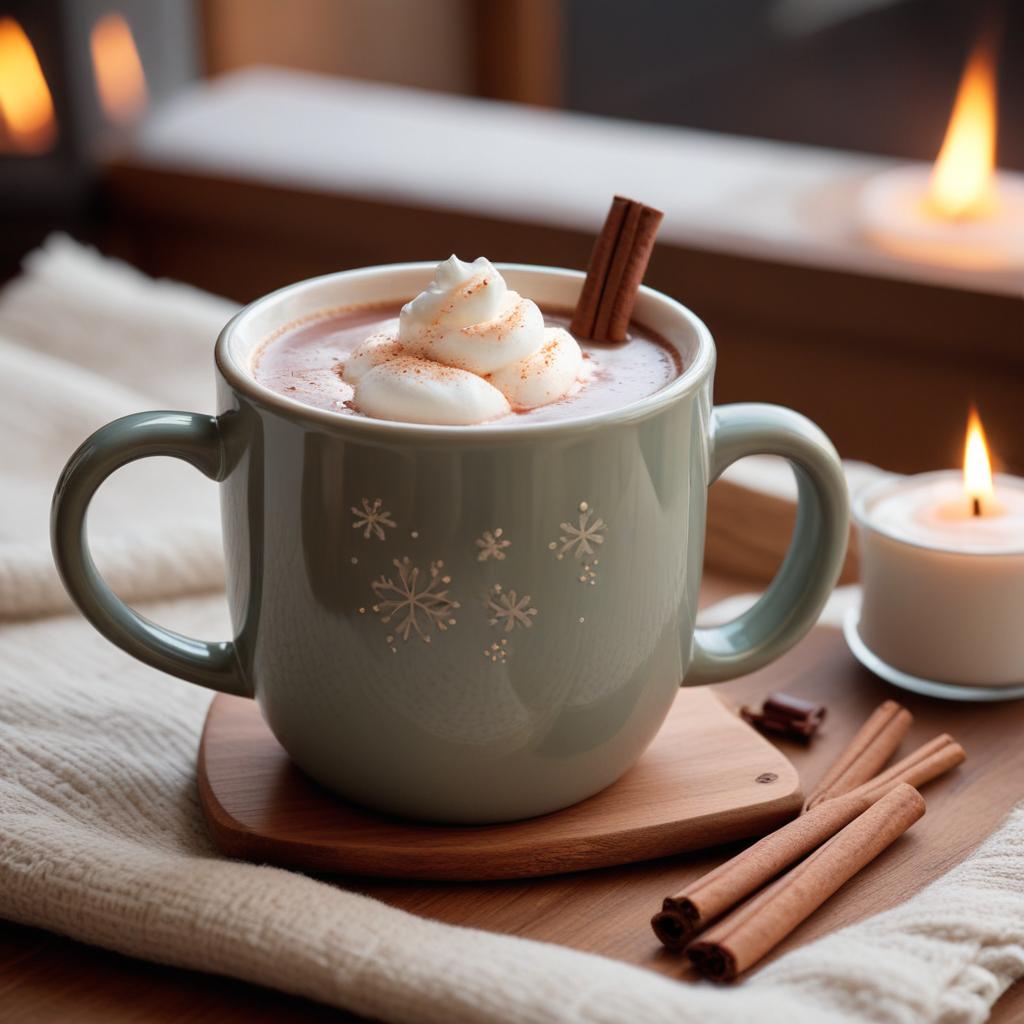 A warm mug of hot chocolate sits on a wooden tray. Whipped cream and cinnamon enhance the drink, with candles flickering nearby.