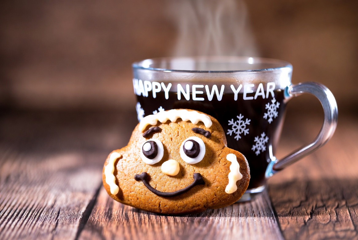 A smiling gingerbread cookie rests next to a steaming cup of coffee, celebrating the New Year with festive vibes in a cozy setting.