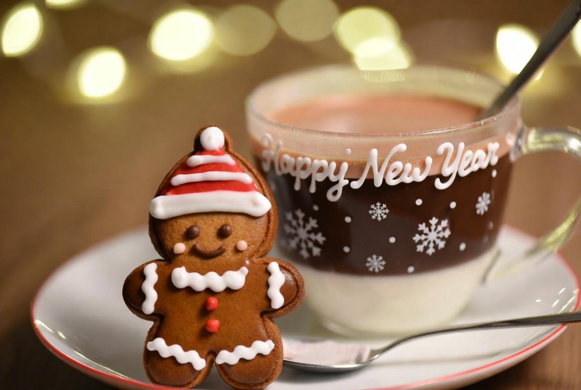 New Year, baking, celebration, comfort, cookie, cozy, decoration, dessert, festive, gingerbread, holiday, hot chocolate, joy, plate, seasonal, smiling, sweet, treats, warm drink, winter