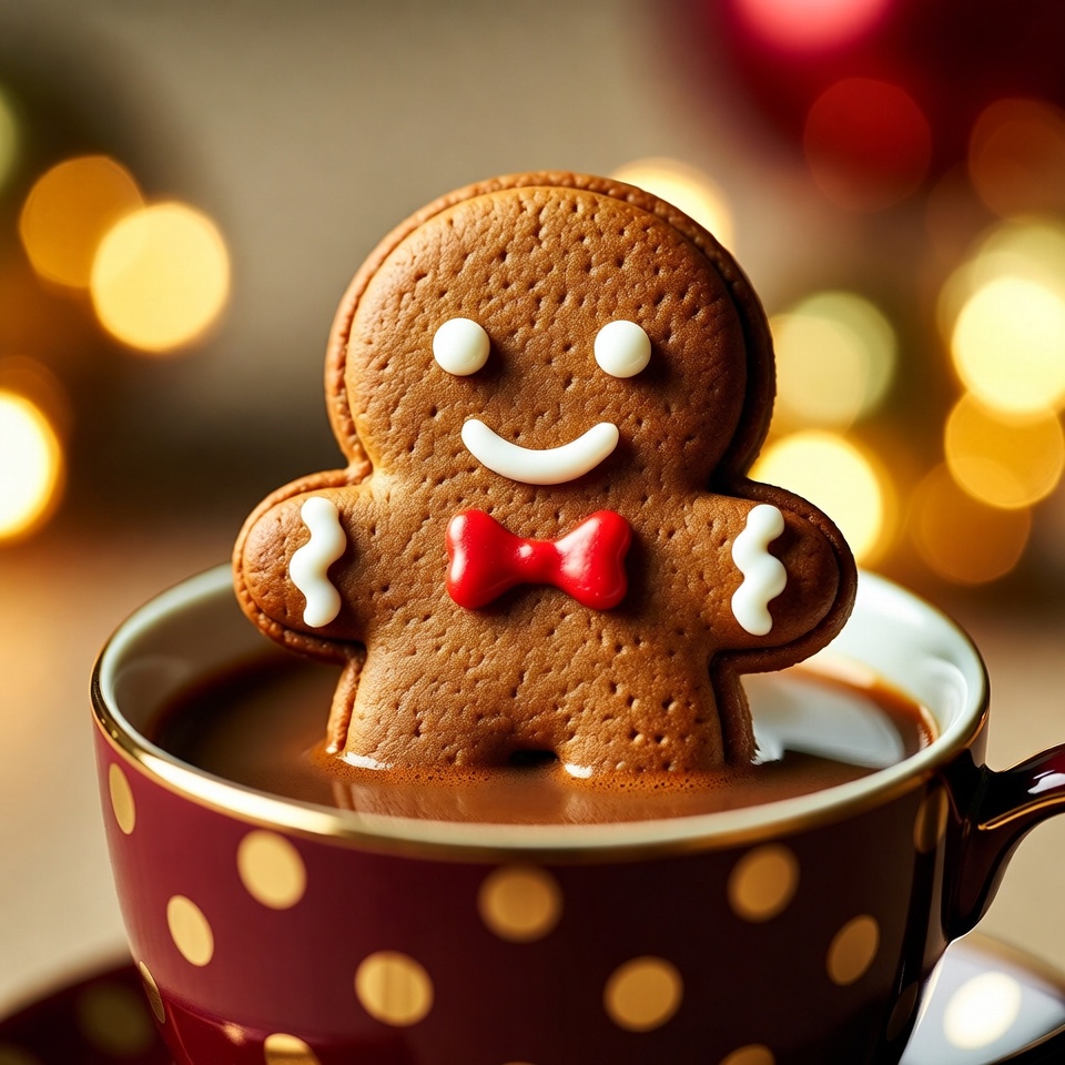 A cheerful gingerbread cookie with a bowtie sits on the edge of a festive polka-dot cup filled with hot chocolate, creating a warm holiday scene.