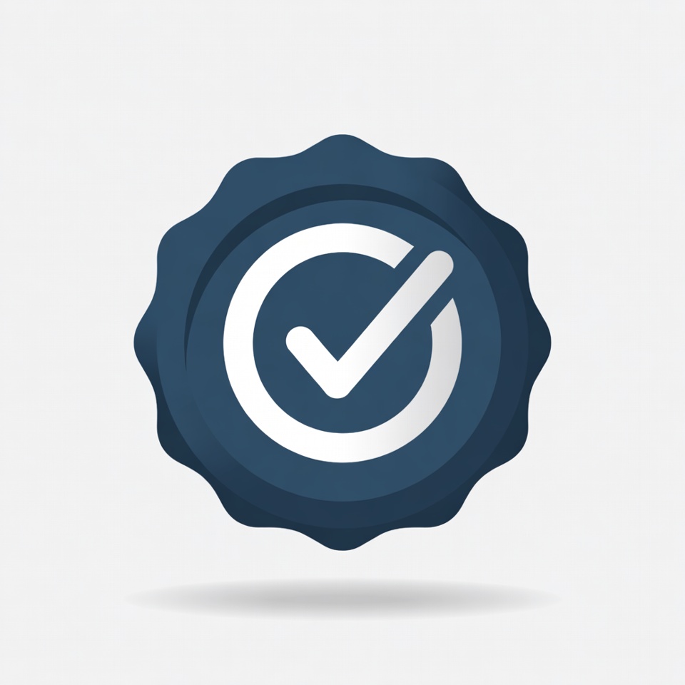 A round seal design features a blue checkmark in the center. It represents approval or validation, suitable for certification.